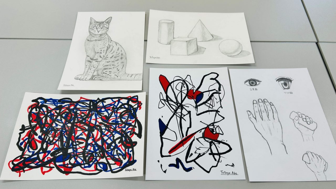 美術館や動物園などに出向く『フィールドワーク』や、自習用の『コワーキングタイム』など、平日の講座とはひと味違う内容が多い土曜講座。今回は、抽象画のコンクールで受賞歴を持つ利用者の方に『絵画講座』を開いていただきました。そんな『先生』主導のもと、簡単に抽象画を描いてみる時間や、デッサンする際の陰影のつけ方などのコツなどを学ぶことが出来ました。普段イラストを描く機会がない利用者の方も、『あーでもない。こーでもない』と悩みながらも思い思いにペンを走らせ、楽しまれていました。