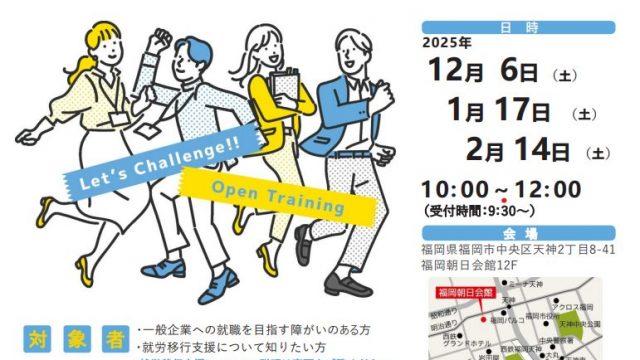 福岡イベント情報 【天神】12・1・2月オープントレーニング(体験・相談会)開催します! 2025年11月26日 k-watanabe 就労移行支援事業所チャレンジド・アソウ こんにちは、チャレンジド・アソウ福岡本社です。 就労移行支援事業所の利用を検討されている方、またそのご家族に向けて、オープントレーニン …