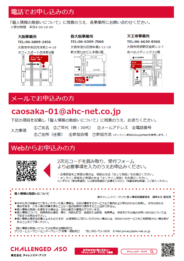 - お申し込み方法:各事業所へお電話またはメールでお申し込みください