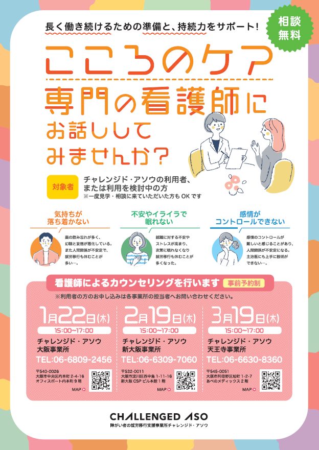 大阪エリア(大阪・新大阪・天王寺)にて1/22(木)、2/19(木)、3/19(木)に看護師によるカウンセリングを開催します