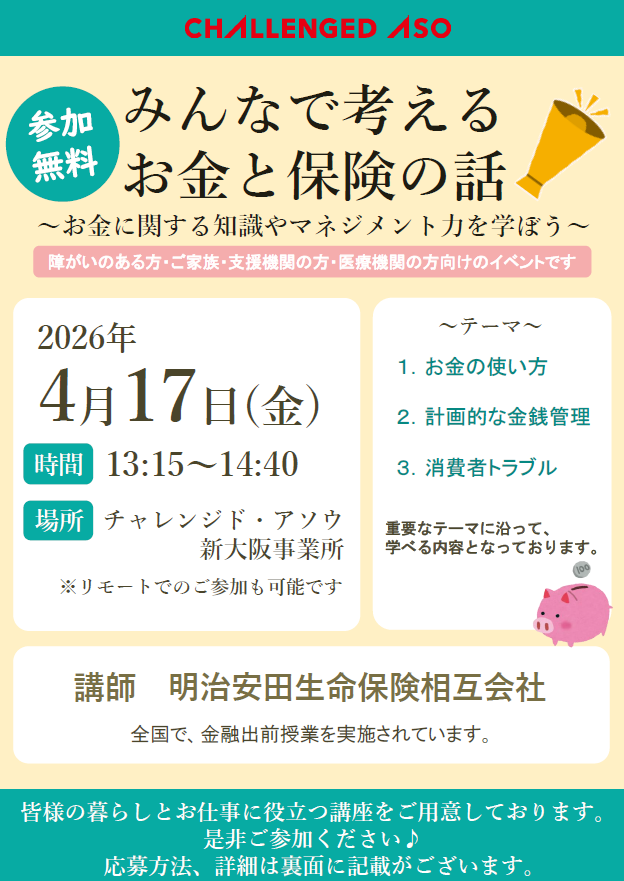 『みんなで考えるお金と保険の話~お金に関する知識やマネジメント力を学ぼう~』セミナーを開催いたします!