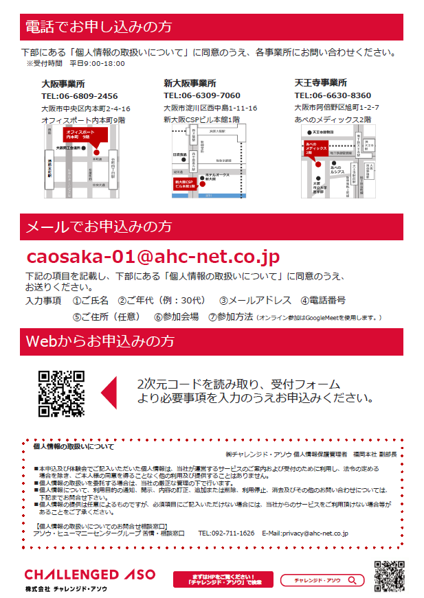 ご氏名 ②ご年代(例:20代) ③メールアドレス ④電話番号 ⑤ご住所(任意) ⑥参加希望の事業所(大阪・新大阪・天王寺)を記載してください。