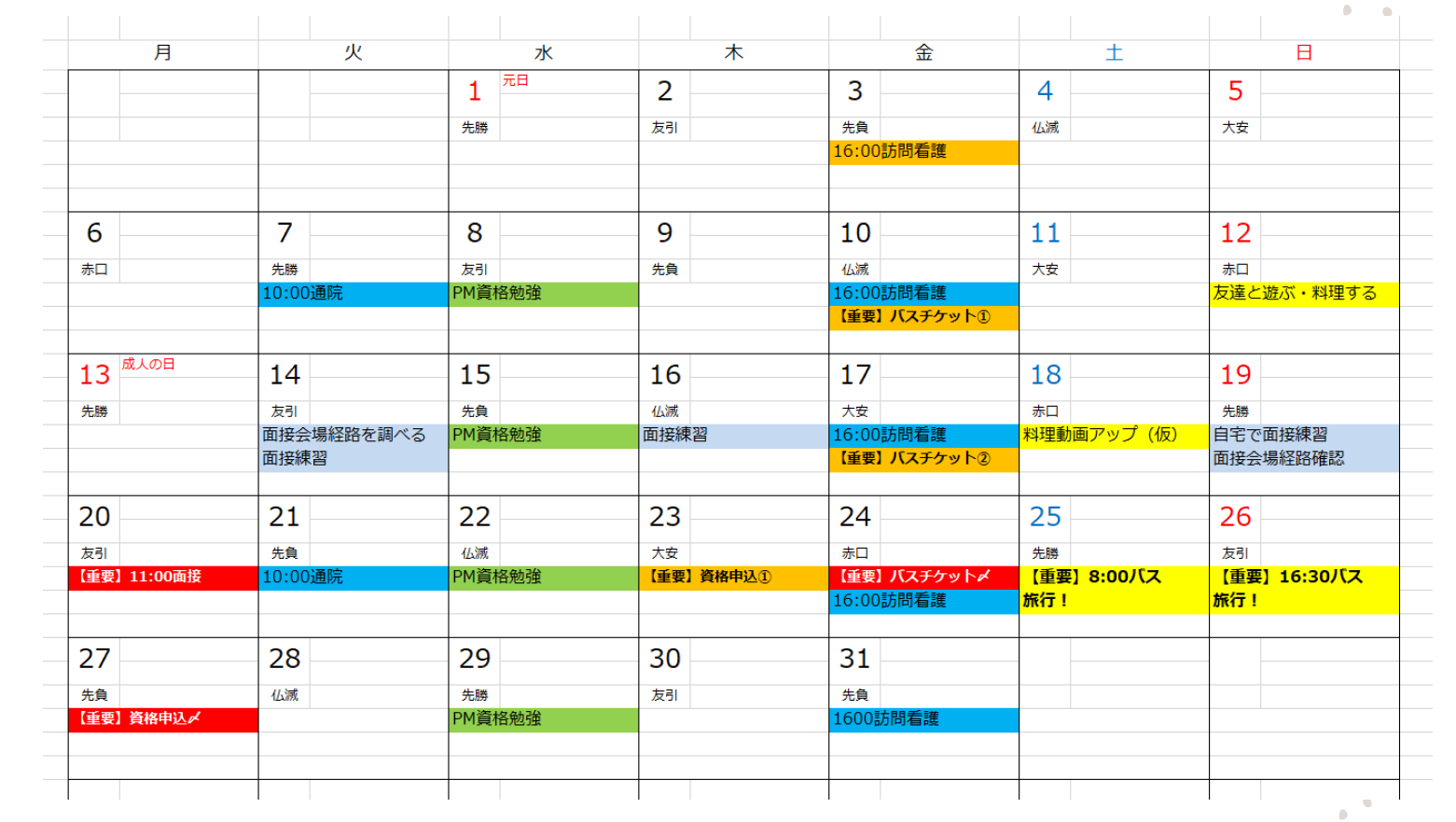 訓練、プライベート、通院、就活など、グループごとに色分け